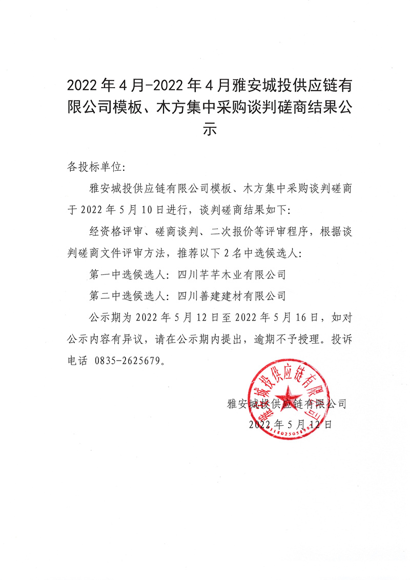 2022年4月-2023年4月雅安城投供應鏈有限公司模板、木方集中采購談判磋商結(jié)果公示