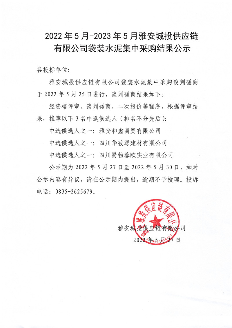 2022年5月-2023年5月雅安城投供應(yīng)鏈有限公司袋裝水泥集中采購結(jié)果公示