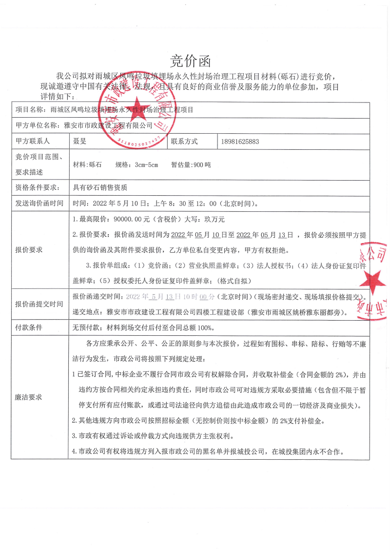 雨城區(qū)鳳鳴垃圾填埋場永久性封場治理工程項目材料(礫石)競價公告