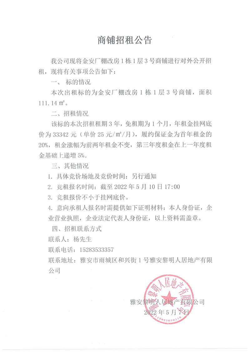 金安廠(chǎng)棚改房1棟1層3號(hào)商鋪招租公告