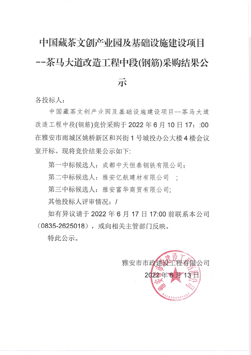 中國藏茶文創(chuàng)產(chǎn)業(yè)園及基礎(chǔ)設(shè)施建設(shè)項 茶馬大道改造工程中段鋼筋采購結(jié)果公示