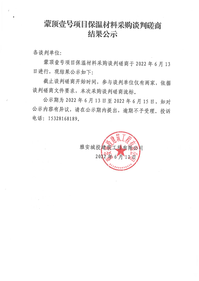 蒙頂壹號(hào)項(xiàng)目保溫材料采購談判磋商結(jié)果公示
