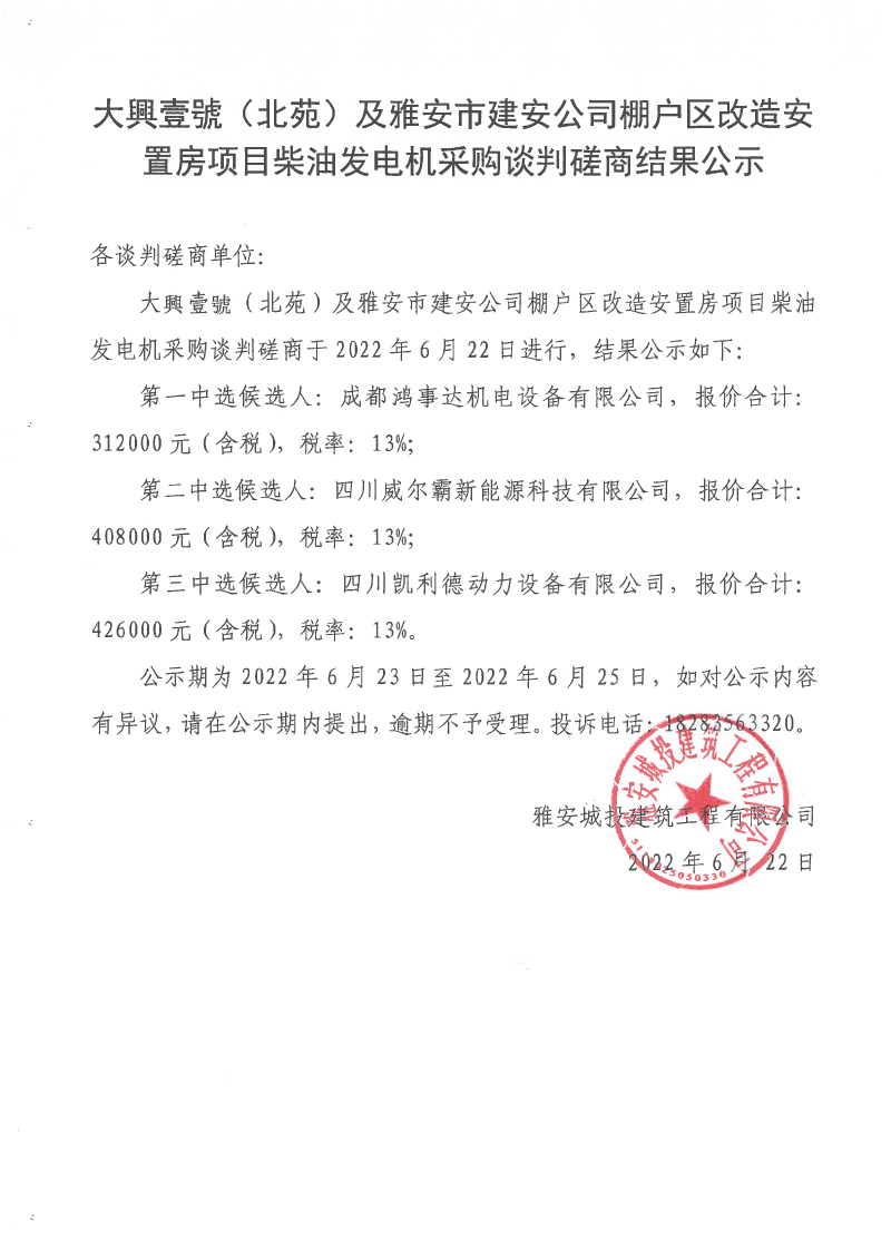 大興壹號(hào)(北苑)及雅安市建安公司棚戶區(qū)改造安置房項(xiàng)目柴油發(fā)電機(jī)采購(gòu)談判磋商結(jié)果公示
