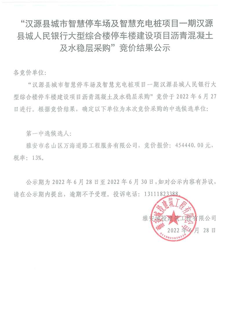 漢源縣城市智慧停車場及智慧充電樁項目一期漢源縣城人民銀行大型綜合樓停車樓建設(shè)項目瀝青混凝土、水穩(wěn)層采購競價結(jié)果公告