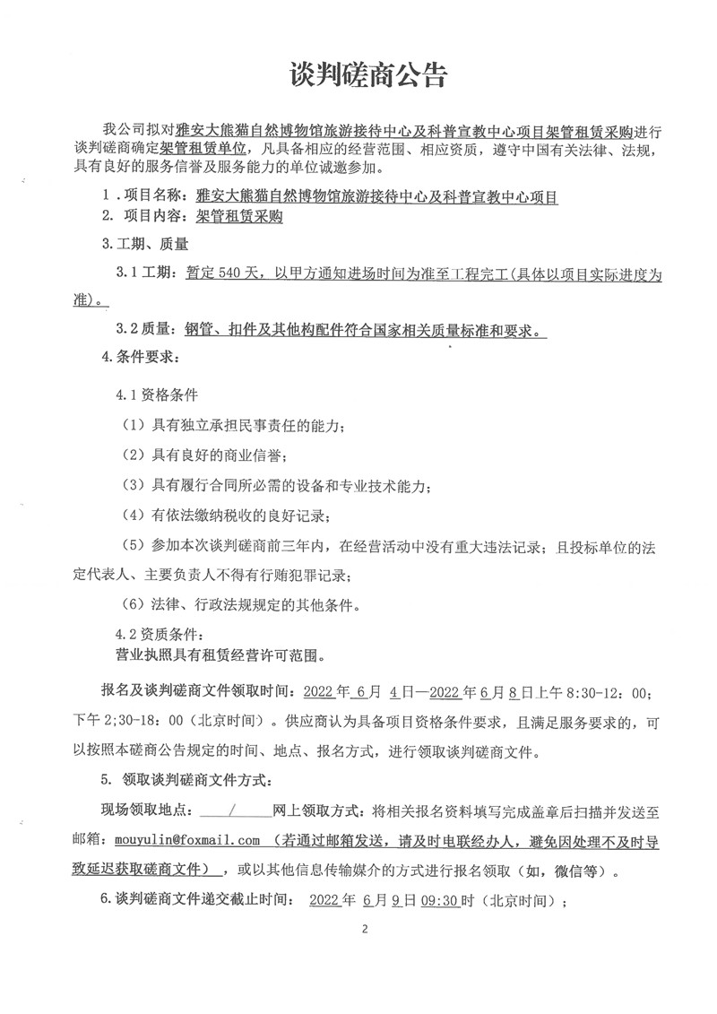 雅安大熊貓自然博物館旅游接待中心及科普宣教中心項目架管租賃采購談判磋商公告
