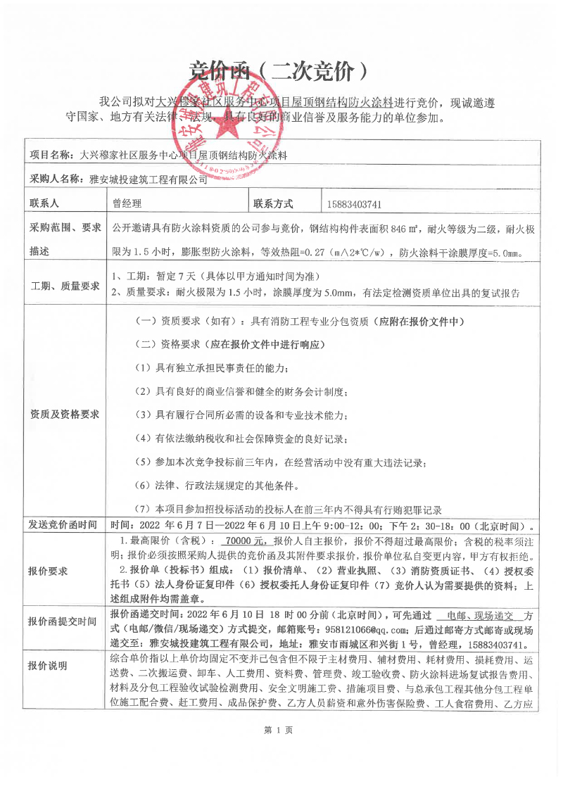 大興穆家社區(qū)服務(wù)中心項(xiàng)目屋頂鋼結(jié)構(gòu)防火涂料競價公告