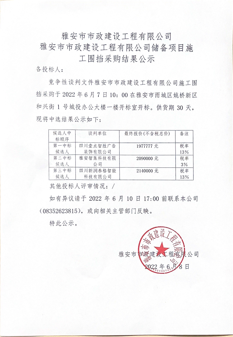 雅安市市政建設(shè)工程有限公司儲備項(xiàng)目施工圍擋招采結(jié)果公示