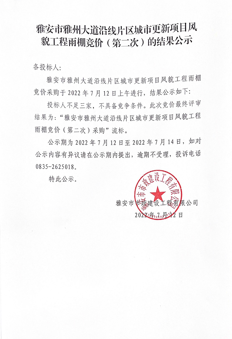 雅安市雅州大道沿線片區(qū)城市更新項目風貌工程雨棚競價(第二次)的結(jié)果公示