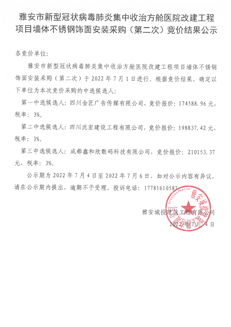 雅安市新型冠狀病毒肺炎集中收治方艙醫(yī)院改建工程項目墻體不銹鋼飾面安裝采購(第二次)競價結(jié)果公示