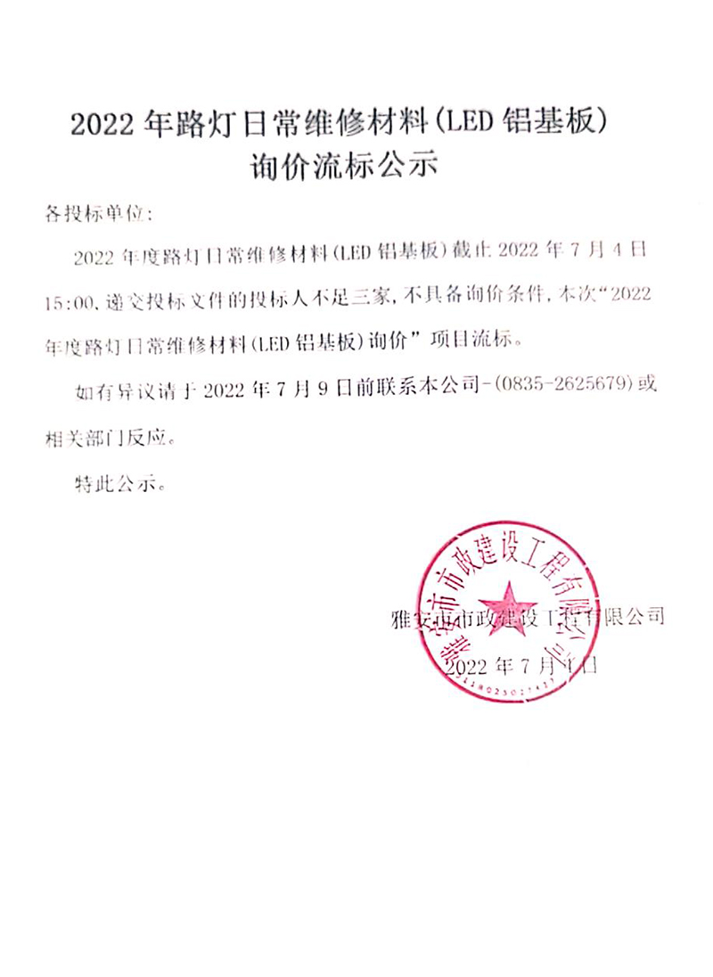 2022年路燈日常維修材料(LED鋁基板)詢價(jià)流標(biāo)公示