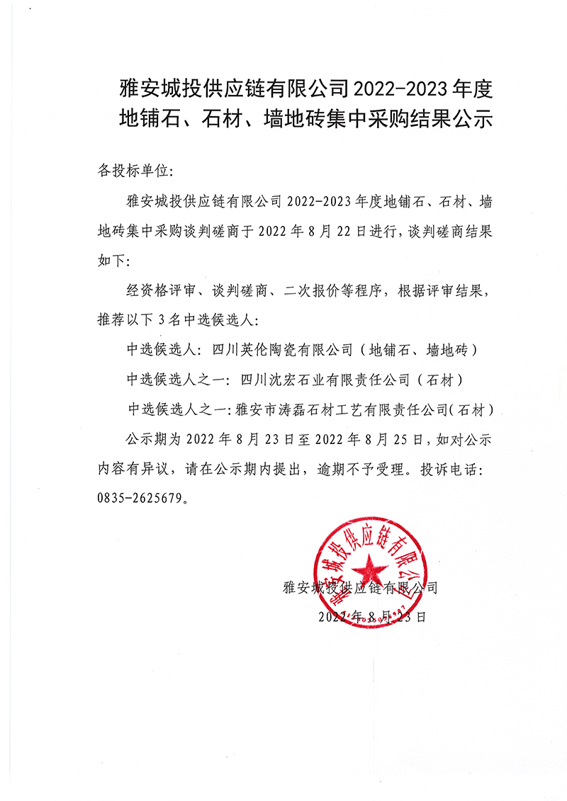 雅安城投供應鏈有限公司2022-2023年度地鋪石、石材、墻地磚集中采購結(jié)果公示
