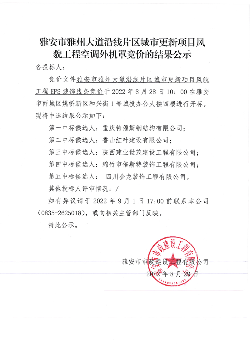 雅安市雅州大道沿線片區(qū)城市更新項(xiàng)目風(fēng)貌工程空調(diào)外機(jī)罩競(jìng)價(jià)的結(jié)果公示
