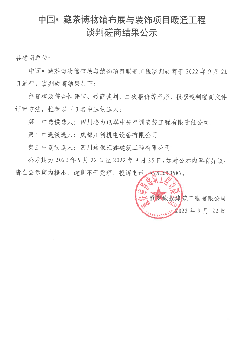 中國• 藏茶博物館布展與裝飾項目暖通工程談判磋商結(jié)果公示