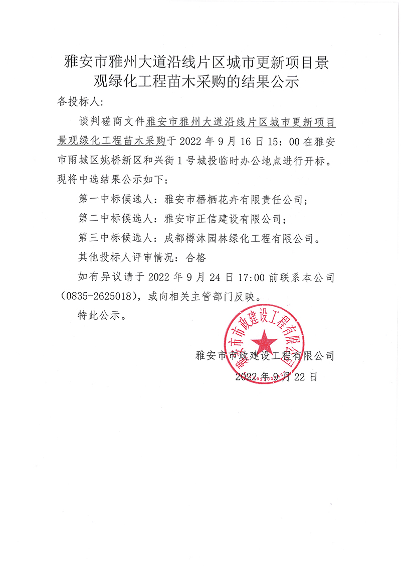 雅安市雅州大道沿線片區(qū)城市更新項(xiàng)目景觀綠化工程苗木采購(gòu)的結(jié)果公示