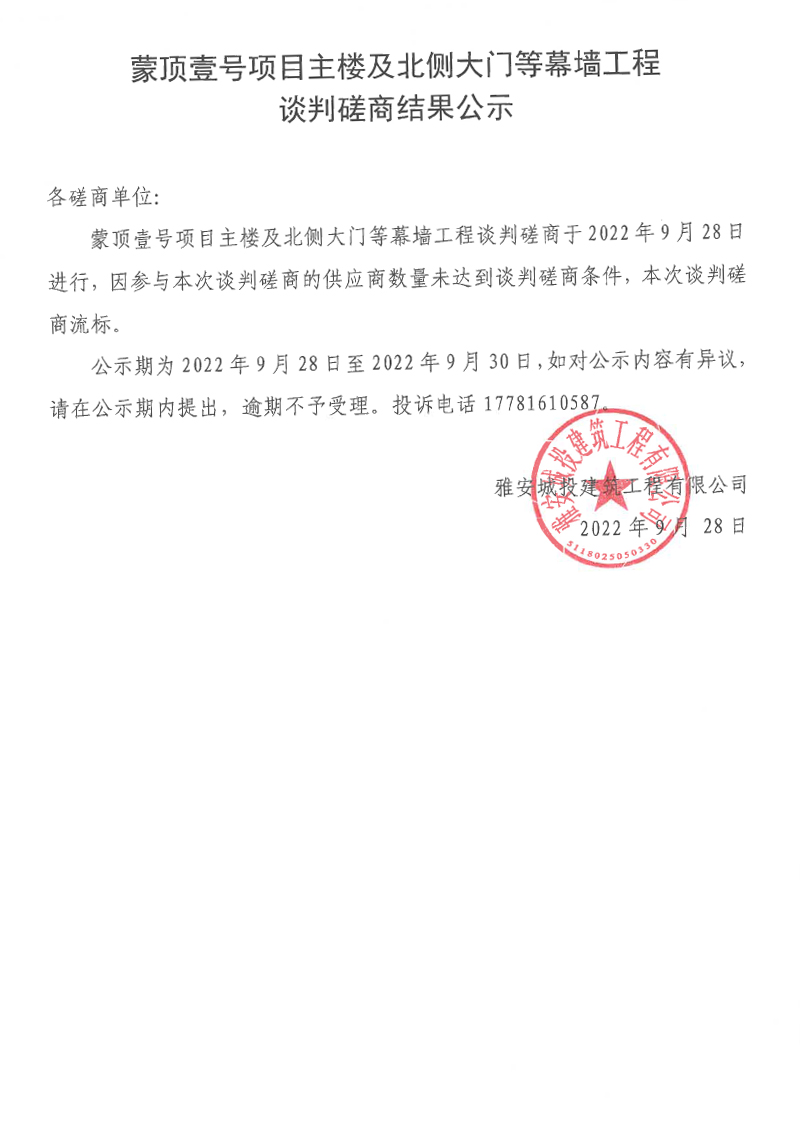 蒙頂壹號項目主樓及北側大門等幕墻工程談判磋商結果公示
