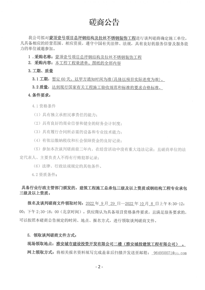 蒙頂壹號項目總坪鋼結構及拉絲不銹鋼裝飾工程談判磋商公告