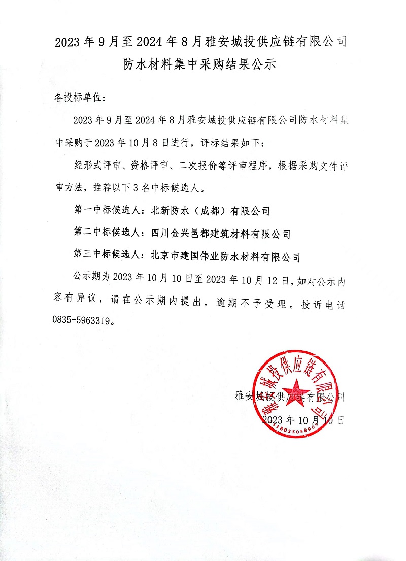 2023年9月至2024年8月雅安城投供應(yīng)鏈有限公司防水材料集中采購(gòu)結(jié)果公示