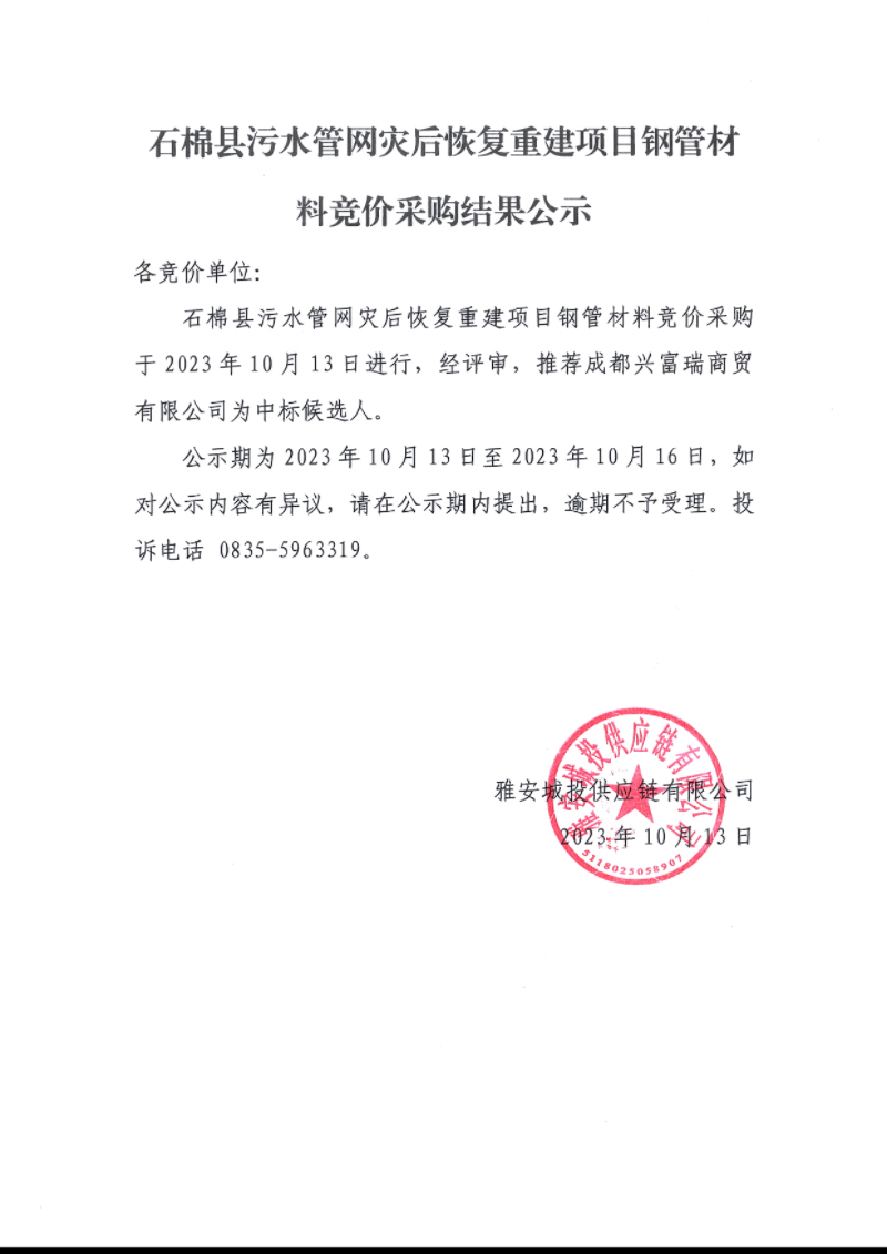 石棉縣污水管網(wǎng)災(zāi)后恢復(fù)重建項(xiàng)目鋼管材料競價(jià)采購結(jié)果公示