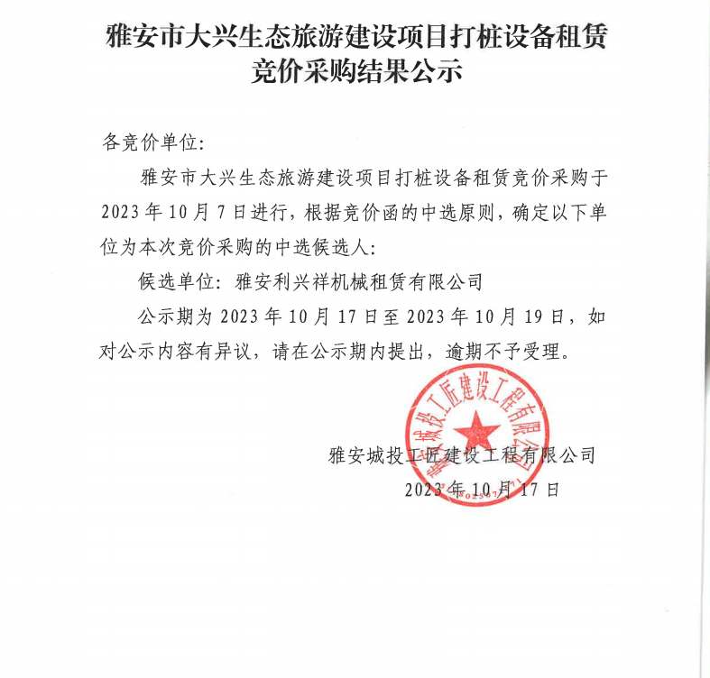 雅安市大興生態(tài)旅游建設(shè)項(xiàng)目打樁設(shè)備租賃競價(jià)采購結(jié)果公示