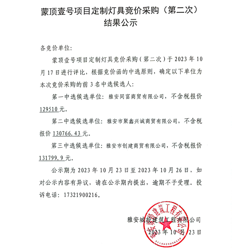 蒙頂壹號項目定制燈具競價采購(第二次)結(jié)果公示