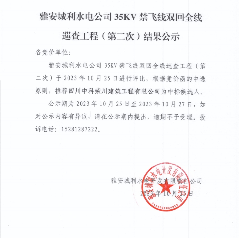 雅安城利水電公司35KV禁飛線雙回全線巡查工程(第二次)結果公示
