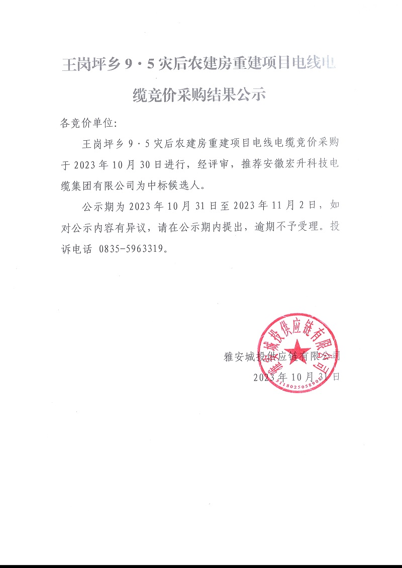 王崗坪鄉(xiāng)9.5災(zāi)后農(nóng)建房重建項(xiàng)目電線電纜競(jìng)價(jià)采購結(jié)果公示