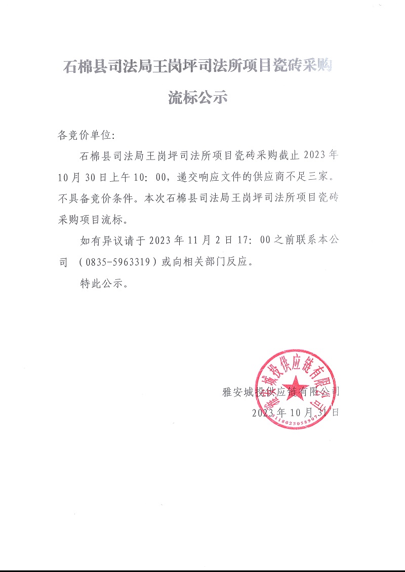石棉縣司法局王崗坪司法所項目瓷磚采購流標公示