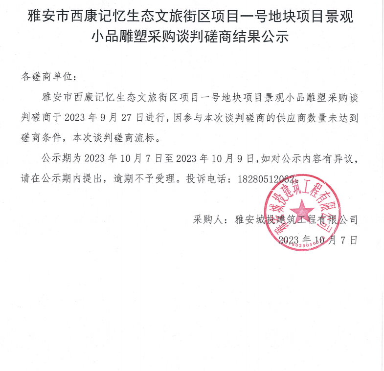雅安市西康記憶生態(tài)文旅街區(qū)項目一號地塊項目景觀小品雕塑采購談判磋商結果公示