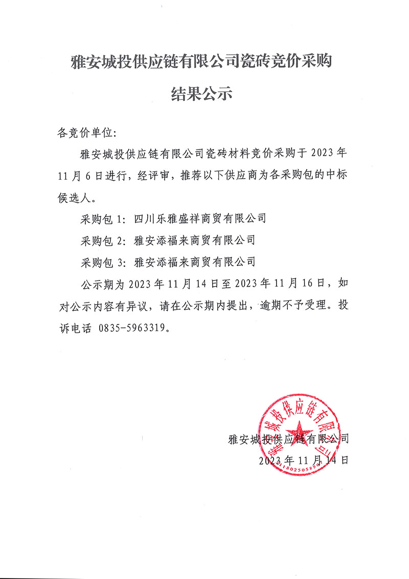 雅安城投供應鏈有限公司瓷磚競價采購結果公示