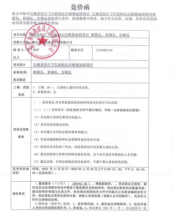石棉縣醫(yī)療衛(wèi)生機(jī)構(gòu)災(zāi)后維修加固改造項(xiàng)目采購樹脂瓦、彩鋼瓦、巖棉瓦材料競價(jià)公告