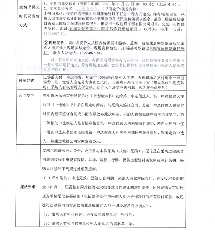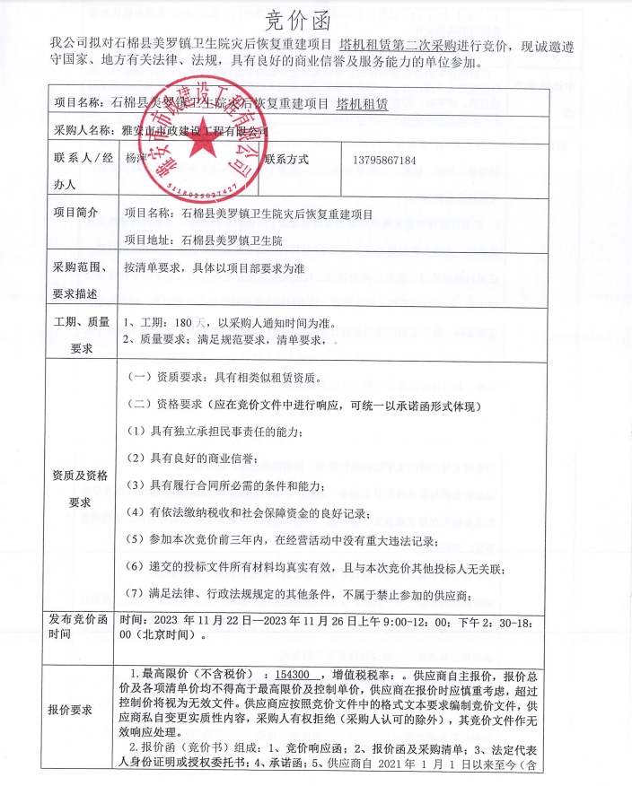 石棉縣美羅鎮(zhèn)衛(wèi)生院災后恢復重建項目塔機租賃(第二次)采購競價公告
