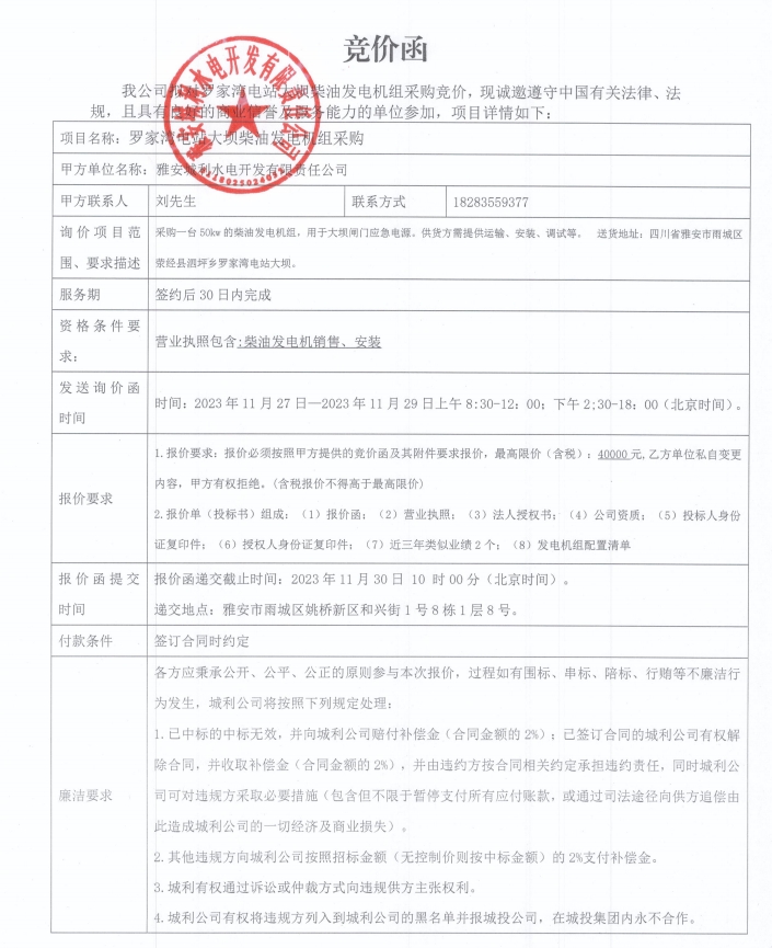 羅家灣電站大壩柴油發(fā)電機(jī)組采購競價公告