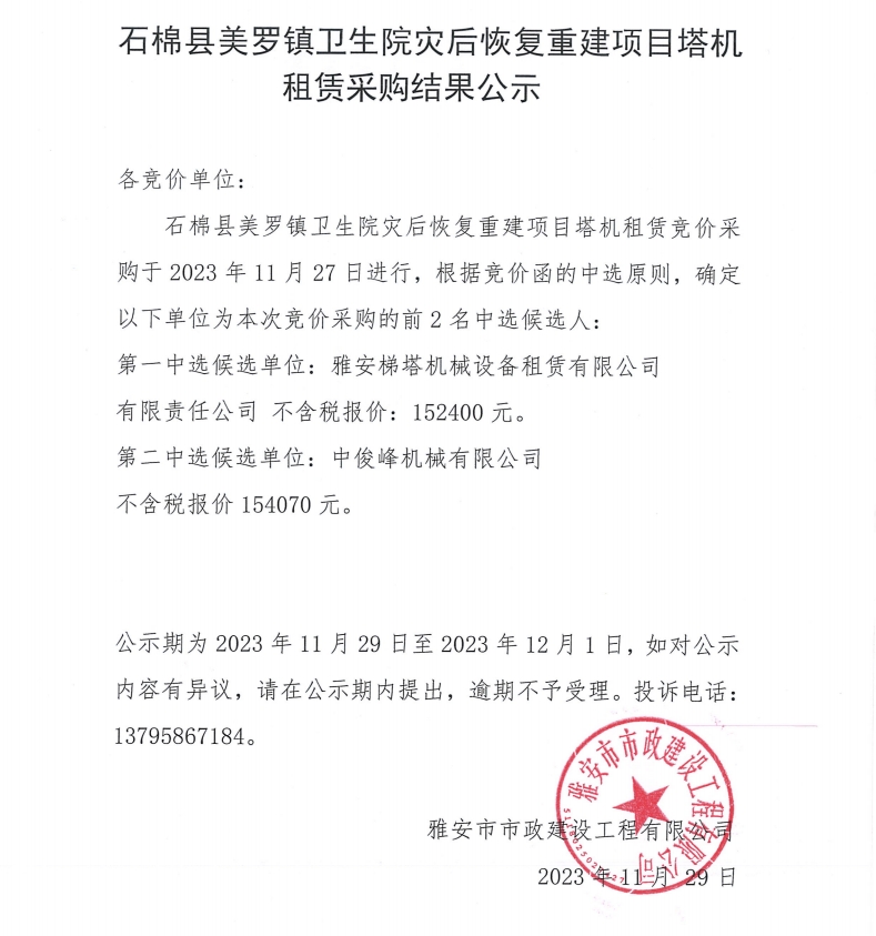 石棉縣美羅鎮(zhèn)衛(wèi)生院災(zāi)后恢復(fù)重建項(xiàng)目塔機(jī)租賃采購結(jié)果公示