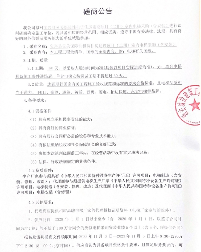 寶興縣靈關保障性租賃住房建設項目(二期)室內(nèi)電梯采購(含安裝)談判磋商公告