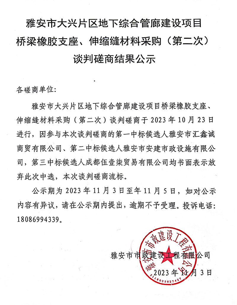 雅安市大興片區(qū)地下綜合管廊建設項目橋梁橡膠支座、伸縮縫材料采購(第二次)談判磋商結(jié)果公示