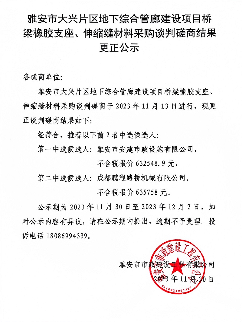 雅安市大興片區(qū)地下綜合管廊建設(shè)項(xiàng)目橋梁橡膠支座、伸縮縫材料采購談判磋商結(jié)果更正公示