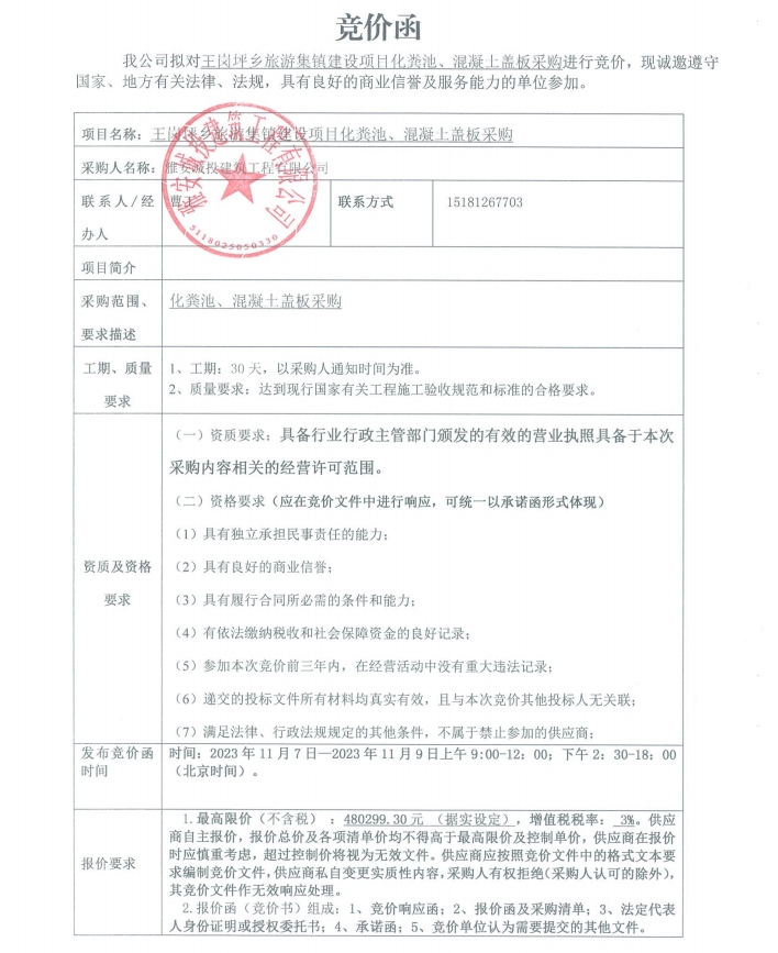 王崗坪鄉(xiāng)旅游集鎮(zhèn)建設(shè)項(xiàng)目化糞池、混凝土蓋板采購競價(jià)公告