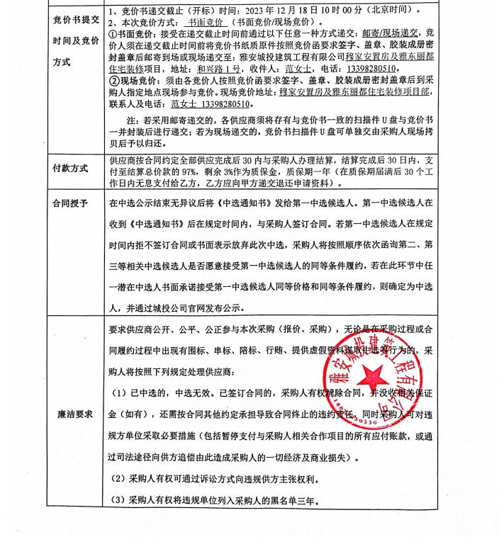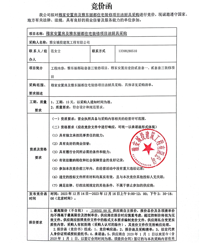 穆家安置房及雅東麗都住宅裝修項目潔廚具采購競價公告