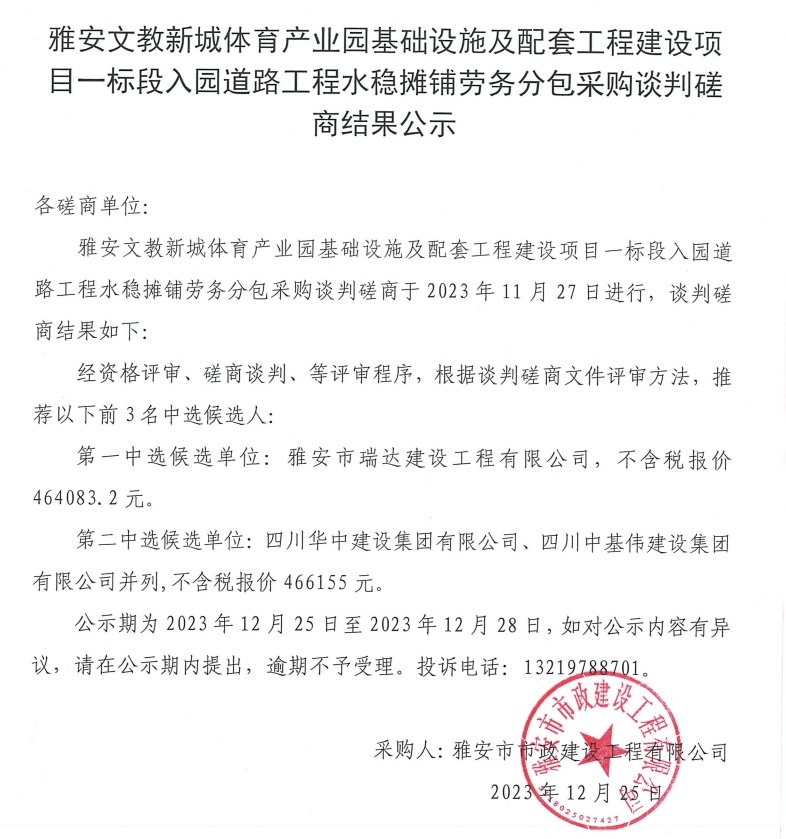 雅安文教新城體育產(chǎn)業(yè)園基礎(chǔ)設(shè)施及配套工程建設(shè)項目一標段入園道路工程水穩(wěn)攤鋪勞務(wù)采購談判磋商結(jié)果公示