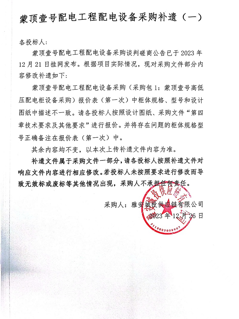 蒙頂壹號配電工程配電設(shè)備采購補(bǔ)遺(一)