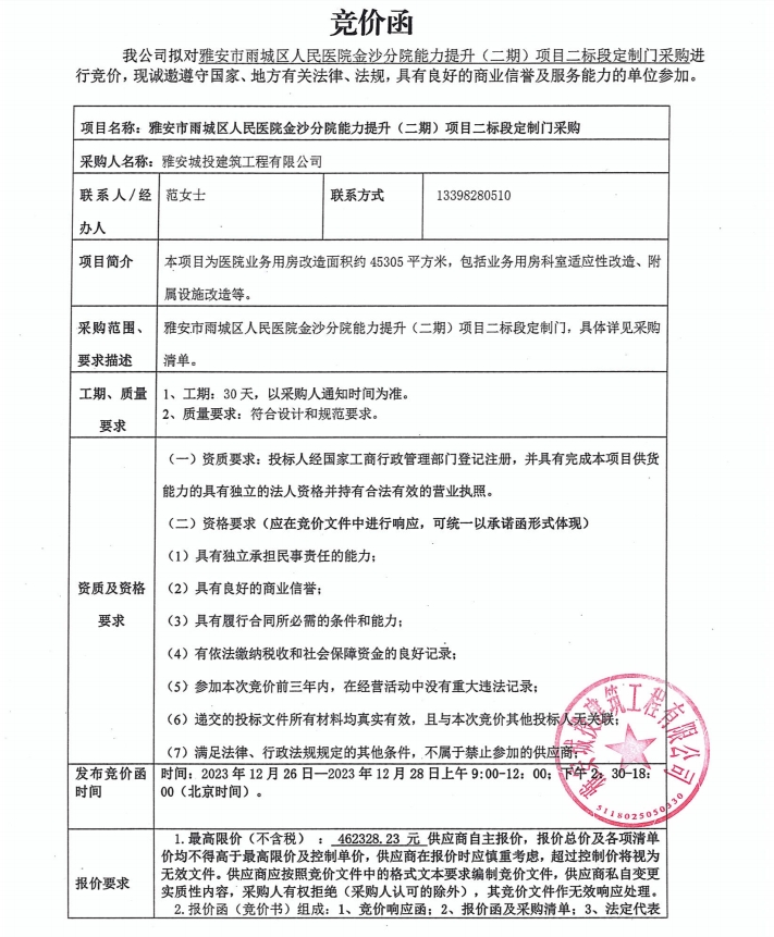 雅安市雨城區(qū)人民醫(yī)院金沙分院能力提升(二期)項目二標(biāo)段定制門采購競價公告