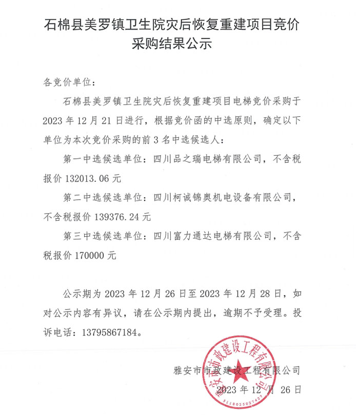 石棉縣美羅鎮(zhèn)衛(wèi)生院災(zāi)后恢復(fù)重建項(xiàng)目競(jìng)價(jià)采購(gòu)結(jié)果公示
