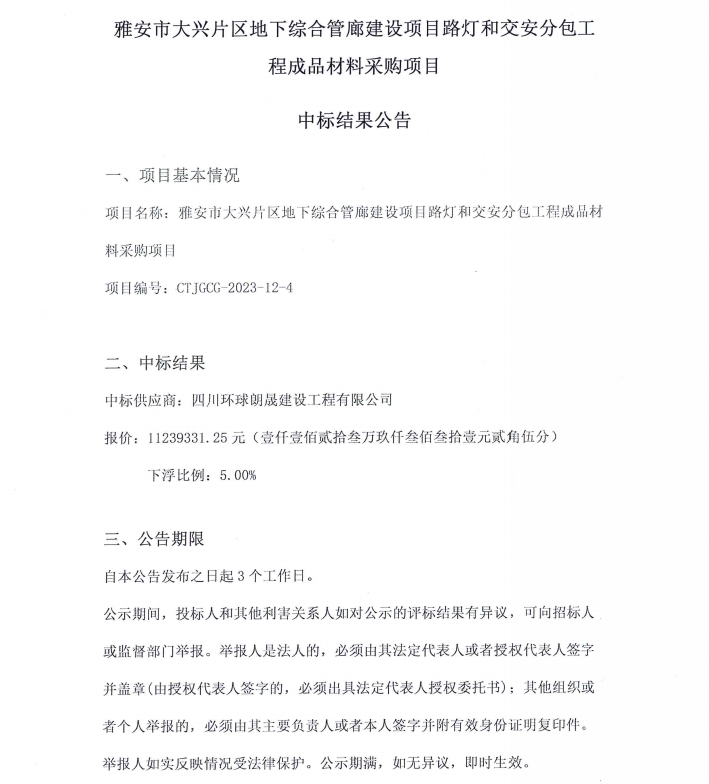 雅安市大興片區(qū)地下綜合管廊建設(shè)項目路燈和交安分包工程成品材料采購項目中標結(jié)果公告