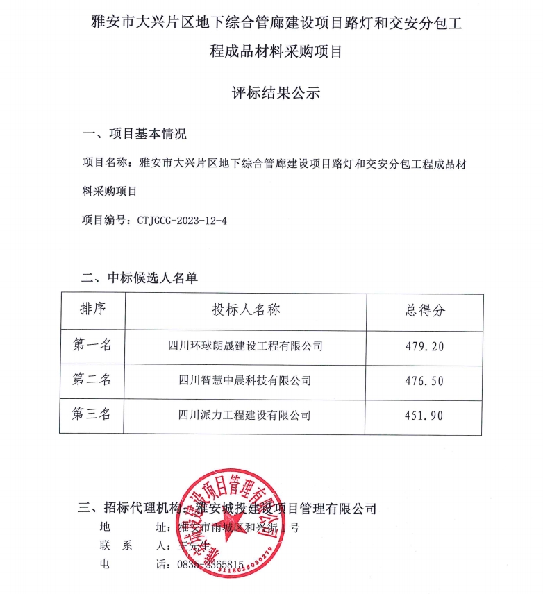 雅安市大興片區(qū)地下綜合管廊建設(shè)項(xiàng)目路燈和交安分包工程成品材料采購(gòu)項(xiàng)目評(píng)標(biāo)結(jié)果公示