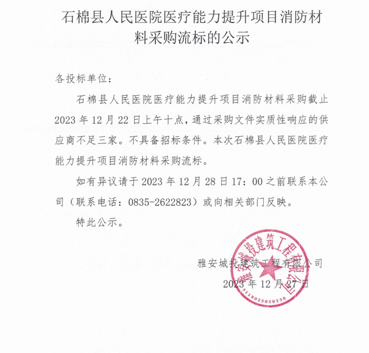 石棉縣人民醫(yī)院醫(yī)療能力提升項(xiàng)目消防材料采購流標(biāo)的公示