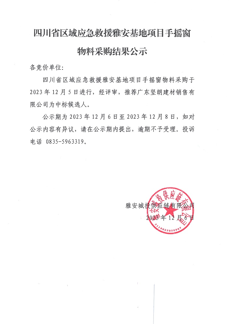 四川省區(qū)域應(yīng)急救援雅安基地項(xiàng)目手搖窗物料采購結(jié)果公示