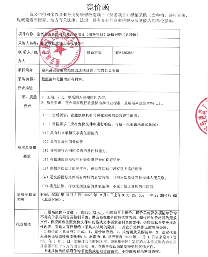 寶興縣業(yè)務用房維修改造項目(儲備項目)綠植采購(含種植)競價公告