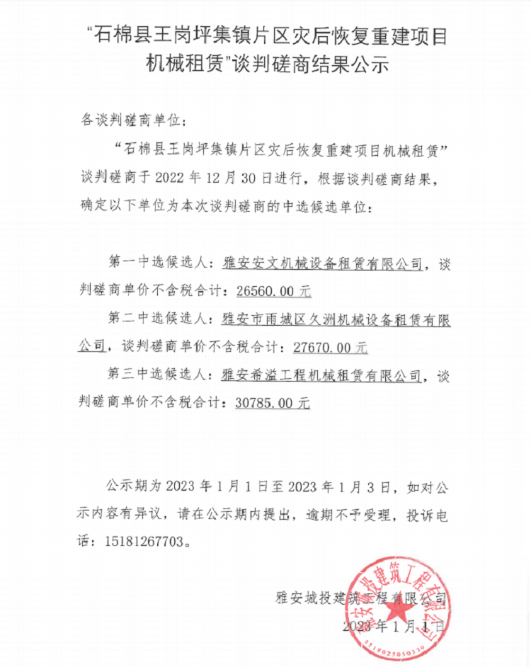 “石棉縣王崗坪集鎮(zhèn)片區(qū)災(zāi)后恢復重建項目機械租賃”談判磋商結(jié)果公示