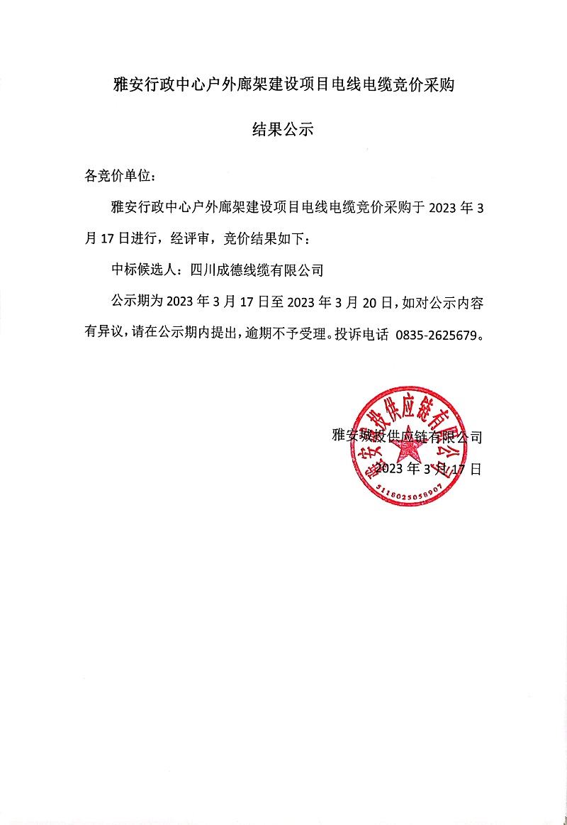 雅安行政中心戶外廊架建設項目電線電纜競價采購結(jié)果公示
