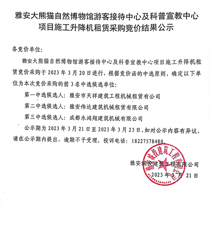 雅安大熊貓自然博物館游客接待中心及科普宣教中心項目施工升降機租賃采購競價結(jié)果公示